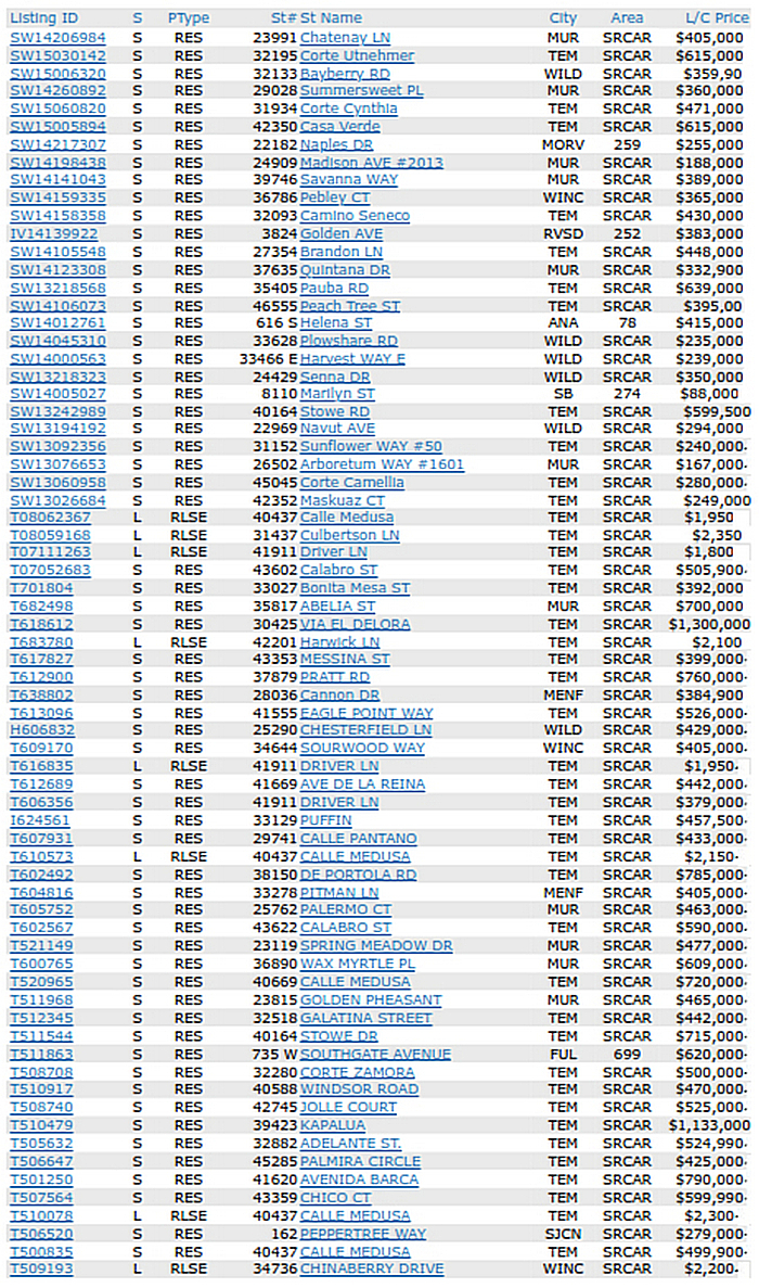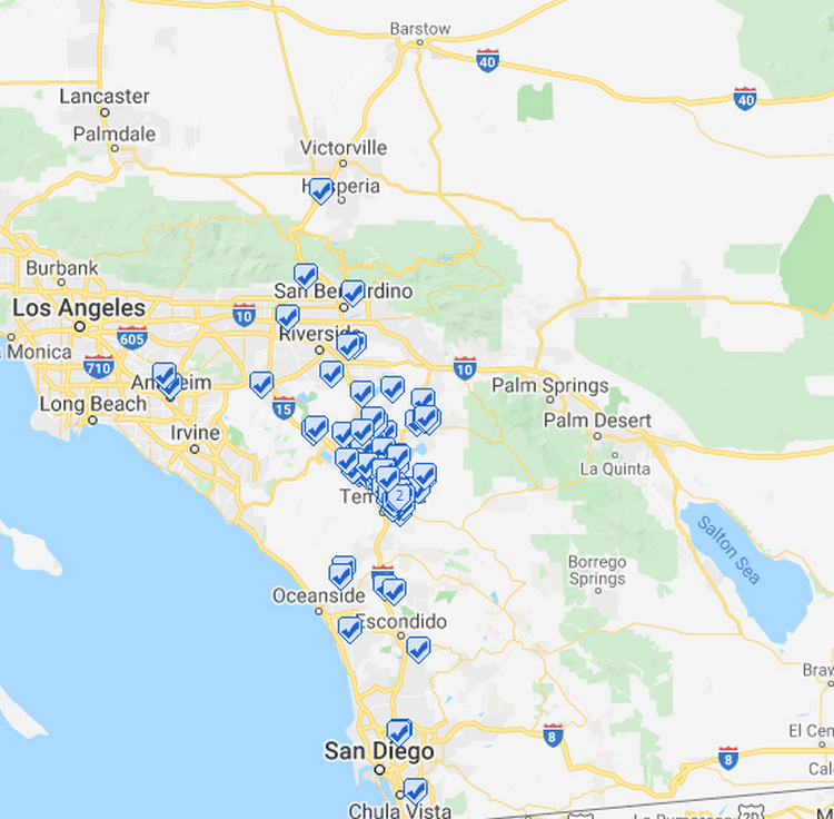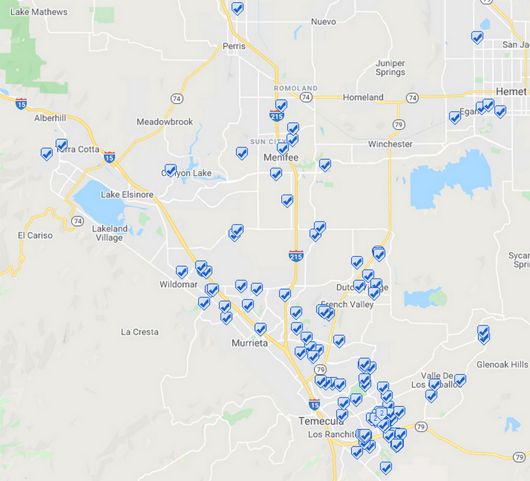 and as far north as El Dorado Hills (near Sacramento), but especially in Temecula, Murrieta, Winchester, Menifee,
